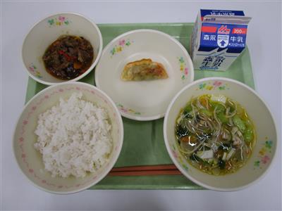 髙木さんの育てたにらを使ったスープに、早野さんの育てたピーマンを使ったチンジャオロースです。益城町では、さまざまな野菜が育てられています。農家さんたちは、みなさんにおいしく食べてもらえることをとても喜んでくれているので、今日もしっかり食べてお皿を空っぽにしましょう!体育大会前は水分・ビタミン補給のためみかん果汁がつきます。今日は木山中・益城中についています。